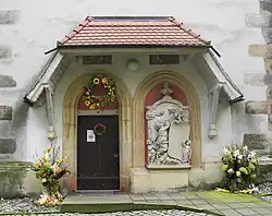 Im Altarraum sind zwei Sandsteingrabplatten aufgestellt, auf denen jeweils ein stehender Ritter dargestellt ist; eine Platte ist auf 1602 datiert. Über der Sakristeitür findet sich ein eingemauertes schmales Sandsteinrelief mit zwei Wappen, dazwischen ein Kruzifix. Seitlich hinter dem Altar ist eine Sakramentsnische erhalten.