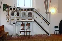 Die Kanzel im Stil der Renaissance ist mit Beschlagwerk reich verziert, ruht auf einer Säule mit Blattkapitell und wurde auf 1602 datiert. Gemälde mit Szenen und Figuren in Ädikularahmung zeigen am Aufgang die Taufe Christi und das Pfingstwunder, an der Kanzel die Evangelisten und in der Mitte Jesus Christus.