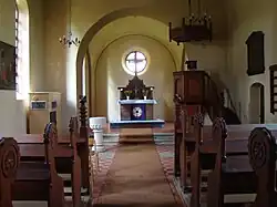 Die von 1725 bis 1728 errichtete Fachwerkkirche mit einem kleinen Holzturm wurde schon 1773 als baufällig benannt.
