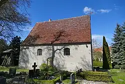 Das heutige Kirchengebäude wurde 1604 als rechteckiger Backsteinbau mit Feldsteinen errichtet. Die Außenwände sind verputzt. Die Saalkirche mit Satteldach ist 13 Meter lang und 9 Meter breit. Nach der Beschreibung Ernst von Haselbergs besaß die Kirche 1885 einen spitzbogigen Westeingang, über dem sich die Jahreszahl 1604 befand. Dieser wurde 1957 segmentbogig umgebaut. Dabei wurden die Fenster beiderseits und oberhalb des Eingangs verändert. Auf der Nord- und Südseite befinden sich jeweils zwei segmentbogige Fenster mit gefaster Laibung. Eine segmentbogige Eingangstür in der Mitte der Südseite sowie ein segmentbogiges Fenster im Ostgiebel, zwei weitere und zwei Rundfenster im darüberliegenden Dachgiebel wurden beim Umbau 1957 zugesetzt. Vor dem zugesetzten Eingang befindet sich eine Tafel zum Gedenken an die Opfer der beiden Weltkriege.