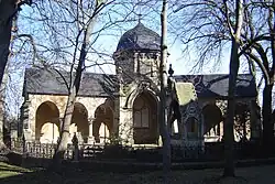 Im Zusammenhang mit dem Neubau der Kirche wurde nordöstlich auf dem Kirchhof ein aufwändiges Erbbegräbnis für die Familie von Alvensleben errichtet, heute meist als Mausoleum bezeichnet. Die Gestaltung in Form einer Säulenhalle orientiert sich am Baustil der Kirche. Sieben zum Kirchhof geöffnete Arkaden umgeben einen zweistöckigen Kuppelbau. Die Arkaden ruhen auf gedrungenen Säulen mit ausladenden Knospenkapitellen. Die Rückwand ist mit Inschriften und Epitaphien ausgestattet. Vor dem Mausoleum wurde 1902 ein Grabmal für die 1897 verstorbene Schlossherrin Anna von Alvensleben aufgestellt. Es wurde von Kaiser Wilhelm II. gestiftet und nach einem Entwurf des Berliner Bildhauers Ludwig Cauer aus französischem Kalkstein angefertigt. Der Sarkophag mit der Figur der Anna von Alvensleben entstand in Berlin, während der Baldachin an Ort und Stelle aus einem mächtigen Block gearbeitet wurde.