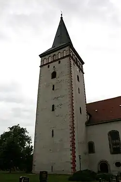 Das Äußere der Kirche wird stark durch die verschiedenen Anbauten beeinflusst. Von der ursprünglich spätromanischen Baugestalt ist noch die Apsis mit einem reich profiliertem Mittelfenster erhalten;[2] Chor, Kirchenschiff und Turm sind im gotischen Stil des 15. und 16. Jahrhunderts errichtet. Das quadratische Schiff hat einen leicht eingezogenen und quadratisch geschlossenen Chor. Auf dem Dach der Apsis befindet sich ein rechteckiger Abschluss. An der Südwand ist der Turm angebaut, dieser verfügt über eine aufgemalte Eckquaderung und ein hohes Pyramidendach.
