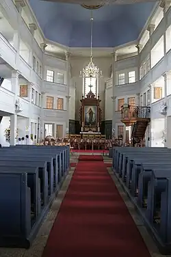 Das Hauptstück der Ausstattung ist ein schlichter Altar von 1897 mit einem Bild des Auferstandenen Christus. Die hölzerne Kanzel aus der gleichen Zeit ist mit achteckigem Korb, Ecksäulchen und gemalten Darstellungen des Salvators und der Evangelisten versehen. Die achteckige Taufe von 1854 ist mit Engelsköpfchen in flachem Relief dekoriert. Die Orgel ist ein Werk von Eule Orgelbau aus dem Jahr 1885 mit heute 15 Registern auf zwei Manualen und Pedal,[1] wurde jedoch später verändert.