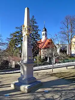 Der heutige Friedhof wurde 1875 an der Obernaundorfer Straße mit einer im Jahre 1889 im historisierenden Stil erbauten Friedhofskapelle und einem Kriegerkreuz von 1929 angelegt.[15] Unterhalb der Kirche stand einst das 1669 erbaute Pfarrgut, welches 1878 durch das heutige Pfarrhaus ersetzt wurde.