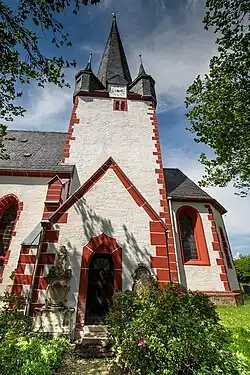Die Kirche ist ein verputzter Bruchsteinbau mit eingezogenem Chor und dreiseitigem Ostschluss, dessen Ecken und Gewände mit Porphyrgliederungen versehen sind. Der Turm mit Spitzhelm ist von vier Dachtürmchen umgeben, an der Chorsüdseite ist die Sakristei angebaut. Das Schiff ist mit Strebepfeilern und hohen Spitzbogenfenstern über zwei kleinen gekuppelten Vorhangbogenfenstern an der Südseite versehen. Die Vorhalle an der Südseite ist mit einem Spitzbogenportal erschlossen; an der Westseite ist ein halbrunder Treppenturm mit Vorhangbogenfenstern angebaut.