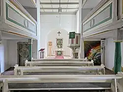 Die Saalkirche ist in wesentlichen Teilen romanischen Ursprungs. Sie hat einen eingezogenen, querrechteckigen Chorturm im Osten, an den eine Apsis mit einer Apsiskalotte angebaut ist. Das Langhaus ist mit einem Krüppelwalmdach bedeckt. Im Innenraum wurden im 17. Jahrhundert zweigeschossige, dreiseitige Emporen eingebaut, deren Brüstungen später erneuert wurden. Ferner wurde er mit einem hölzernen durchlaufenden Tonnengewölbe überspannt, das inzwischen abgehängt wurde. 1899 erhielt der Turm einen neuen Abschluss mit einer geschweiften Haube, die sich in einer offenen Laterne fortsetzt, die mit einer Turmkugel und einer Wetterfahne bekrönt ist. Außerdem wurde der Chor neu ausgestattet. Zur Kirchenausstattung gehört ein neuer Schrein mit sechs kleinen, spätgotischen Statuetten eines Altarretabels. In der Kirche befinden sich mehrere Epitaphien aus dem späten 16. und dem 17. Jahrhundert. Die Orgel wurde am Anfang des 19. Jahrhunderts gebaut.
