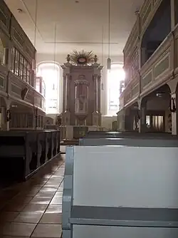 Im Innern ist das Bauwerk flachgedeckt, an der Nord- und Südseite sind bis in den Altarraum geführte doppelte Emporen mit Betstuben eingebaut, im Westen eine Orgelempore.