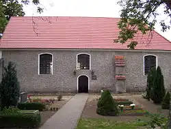 Die Kirche wurde aus Feldstein auf rechteckigem Grundriss errichtet. 1766 erfolgten bauliche Veränderungen. An den Ecken und rechts des Südportals befinden sich gestufte Strebepfeiler. An den Seiten befinden sich je drei segmentbogige Fenster. Das Dach des Putzbaus ist am Ostgiebel abgewalmt.