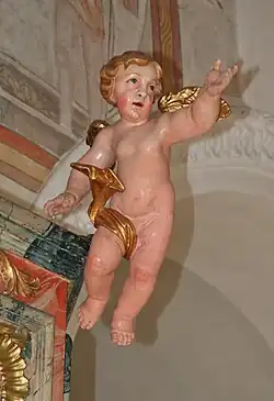 Die Fassade des zweigeschossigen Beinhauses an der Nordwestecke des Friedhofs zeigt die Muttergottes zwischen den Heiligen Stephanus und Mauritius, darunter Fegefeuer. In einer Reihe acht würfelförmiger Nischen stehen Totenschädel.