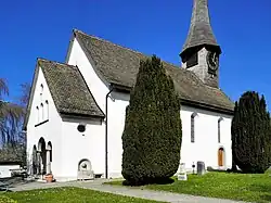 Die Kirche besitzt über dem Chor einen mit Schindeln gedeckten Dachreiter. Dieser besitzt einen quadratischen Grundriss und wird durch einen hohen, achtseitigen Spitzhelm abgeschlossen. Während das abgewalmte Satteldach mit Dachziegeln besetzt ist, ist der Spitzhelm des Dachreiters geschindelt.[2]