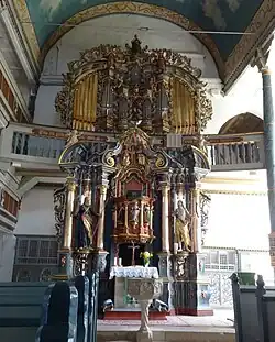 Der Kanzelaltar aus dem Jahr 1775 bildet mit der darüber befindlichen Orgel ein Ensemble. Die Vereinigung von Kanzel und Altar hebt die Bedeutung der Predigt für den lutherischen Gottesdienst hervor. Eine Kanzeluhr links an der Kanzelrückwand diente dem Prediger zur zeitlichen Orientierung. Die Figuren an der Kanzel stellen die vier Evangelisten mit Jesus Christus in der Mitte dar. Über ihr thronen Gott Vater, Sohn und Heiliger Geist in Gestalt einer Taube. Den Altar flankieren die lebensgroßen Figuren von Mose und Johannes der Täufer.