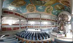 Innen erheben sich zwei dreiseitige Emporen, der mittlere Kirchenraum wird durch ein Tonnengewölbe überspannt. Die barocke Innengestaltung der Kirche stammt aus der 2. Hälfte des 17. Jahrhunderts. Die Kunstmaler Johann Jacob Prazzo und Johann Jacob Gehres aus Meiningen versahen 1766 die Kirche mit prächtigen Malereien: die Säulen wurden blau marmoriert, die Farbe Blau prägt den ganzen Innenraum. Die Felder der Emporenbrüstung tragen Bibelverse und auf dem Tonnengewölbe sind folgende biblische Szenen dargestellt: Ankündigung der Geburt; Jesu Taufe; Verklärung Jesu; Auferstehung; Erscheinung des Auferstandenen vor den Jüngern; Christus neben dem Vater thronend.