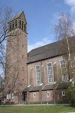 Das Gebäude ist als Backsteinbau mit basilikalem Querschnitt und halbrunder Apsis ausgeführt. Die verwendeten Binder aus Stahlbeton zeigen im Inneren flache Spitzbögen und verweisen wie auch das Stufenportal und der Bogenfries am Turm auf weitaus ältere Bautraditionen. Man merkt ihm den Entwurf aus der Zeit vor dem Zweiten Weltkrieg deutlich an.