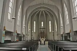 Der Innenraum erinnert mit seiner hohen Decke, den Spitzbögen und den schlanken Fenstern an gotische Kirchen. Das Gestühl beiderseits des Mittelgangs ist auf die Apsis und den dortigen Altar ausgerichtet, der von der Kreuzigungsgruppe beherrscht wird.