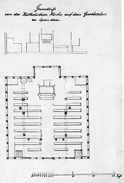 Einem Kirchbau innerhalb des Festungsrayons der Zitadelle stand ein gesetzliches Verbot entgegen. Ein Erwerb der Moritzkirche, die als Kirche entwidmet war und als Magazin genutzt wurde, durch die katholische Gemeinde wurde zwar von der Regierung in Potsdam befürwortet, jedoch vom Spandauer Magistrat nicht genehmigt.[18] Versuche, andere Häuser in der Altstadt zu übernehmen oder die reformierte Johanneskirche simultan mitzunutzen, wie vom Rentamt vorgeschlagen, waren nicht erfolgreich. 1835 drohte der Kirche die baupolizeiliche Schließung wegen Einsturzgefahr – „die ‚Gebetshütte‘ auf dem Plan drohte den Andächtigen auf den Kopf zu stürzen“ (Franz Kohstall[19]). Die Kirche musste innen und außer gestützt werden, und 1835, 1838 und 1841 wurden Reparaturen vorgenommen.[20][21] Gegen eine Verlegung der Kirche vom Gewehrplan nach Spandau richtete sich eine Bittschrift mehrerer auf dem Plan wohnhafter Arbeiter vom 31. Mai 1836 sowie des Küsters und des Organisten, die um ihre Stellung fürchteten; dies wurde jedoch mit Rücksicht auf wehrstrategische Gründe abgelehnt. In den 1840er-Jahren schlossen sich 19 Männer der Gemeinde, die mit protestantischen Frauen verheiratet waren und ihre Kinder protestantisch erzogen, der von Johannes Ronge initiierten deutschkatholischen Bewegung an, jedoch blieb es bei dieser Gruppe.[22]