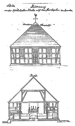Ausweislich zweier Planungsunterlagen aus den Jahren 1804 und 1841 hatte die Kirche einen quadratischen Grundriss mit einer Seitenlänge von 12,55 m. An der Ostseite war eine rechteckige Sakristei angebaut. Wie bei der Vorgängerkapelle gab es keinen Kirchturm und keine Glocken. Es handelte sich um Gebäude in hölzerner Fachwerkbauweise mit ausgemauerten Gefachen. Das Zeltdach der Kirche trug auf seiner Spitze ein Patriarchenkreuz und einen Wetterhahn mit der Jahreszahl 1765, einen Hinweis auf die Bauzeit des Gebäudes. Im Innern trugen zwei auf Holzstützen ruhende Unterzüge die Holzdecke in 3,76 m Höhe. An den Stützen aufgehängt war eine dreiseitige Hufeisenempore, die an der Eingangsseite gegenüber dem Altar die ganze Breite einnahm und an den Seitenwänden mehr als die Hälfte. Auf und unter den Emporen betrug die Stehhöhe jeweils nur 185 cm. Die Kirche bot Platz für maximal 350 dicht gedrängt stehende Besucher.[27]