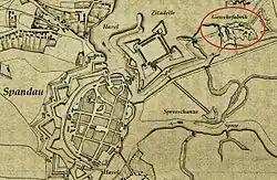 - ↑ Gunther Jahn: Die Bauwerke und Kunstdenkmäler von Berlin. Stadt und Bezirk Spandau. Berlin 1971, S. 142–145, hier S. 143f.