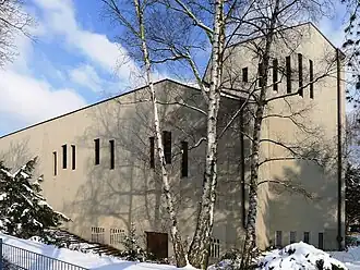 Das Bauwerk ist ganz aus Beton errichtet. Durch seine Ausführung in Sichtbeton wirkt es wie ein Bunker, insbesondere wegen der kleinen Fenster. Bedeckt ist der Baukörper mit Sattel- bzw. Pultdächern. Das Kirchenschiff ist ein symmetrischer Longitudinalbau. Im Norden hat es einen eingeschossigen Anbau, der zum Gemeindehaus führt. Das Portal der Kirche, links und rechts neben der Eingangstür ein Relief, liegt im Westen, dahinter ist ein kleiner Vorraum, über dem sich die Empore für die Orgel befindet. Der große Innenraum steigt in Richtung Apsis in der Höhe an, auch in der Breite nimmt er zu. Die eingezogene Apsis im Osten ist turmhoch, von außen sieht sie wie ein Glockenturm aus. In großer Höhe befinden sich Öffnungen aus Fensterglas, durch sie fällt Tageslicht in den Altarbereich. Das Kirchenschiff hat dagegen farbige Fenster. Das Innere der Kirche wird durch das große Fresko auf der gesamten Fläche der Wand hinter dem Altar beherrscht, das Arne Klingborg gemalt hat. Den übrigen Anteil an der künstlerischen Gestaltung hatte Rex Raab. Unter dem Kirchraum befinden sich eine Krypta für die Weihehandlungen an Werktagen und ein Raum für die Aufbahrung. Die beiden Reliefs aus Beton neben der Haupteingangstür sind von dem Künstler Wilfried Ogilvie (1929–2024).