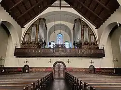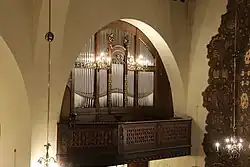 ↑Das Fernwerk befindet sich im Kirchturm; der Schallaustritt ins Kirchenschiff erfolgt über eine Öffnung in der Holzdecke in Höhe der Chororgel, vor dem Altarraum.