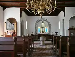 Der Innenraum ist mit einer Balkendecke gedeckt. Die dunkelbraunen Balken ruhen auf gebogenen Konsolen. Auf ihnen liegen die ebenfalls dunklen, furnierte Bretter. Links und rechts neben dem Chor im Westen der Kirche befindet sich jeweils ein Raum, der durch rundbogige Öffnungen mit Chor und Kirchenschiff verbunden ist. Die Öffnung des südlichen Nebenraums zum Kirchenschiff wird heute von einer Orgel eingenommen. Die heutige Orgel wurde 1955 von Wilhelm Hemmersam in Kopenhagen erbaut. Sie besitzt sechs Register, ein Manual und ein angehängtes Pedal.