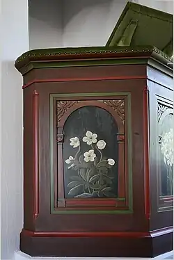 Die Kanzel hat drei Seiten und besteht wie der Altartisch aus Säulen und Füllungen. Die Felder der Füllungen sind mit Darstellungen von Christrosen, Osterglocken und Fackellilien auf schwarzem Grund und geschmückt.