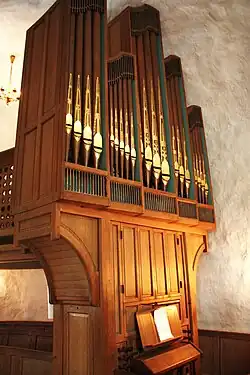 Die heutige Orgel (II/P/13 + 2 Pedaltransmissionen)[9] wurde nach der Kirchenrestaurierung von 1955 im Februar 1956 eingebaut. Ihre Prospektpfeifen sind mit Ornamenten aus Goldfolie belegt. Bei dem neobarocken Instrument handelt es sich um Opus 617 des Orgelbauunternehmens Marcussen & Søn.[10] Die Disposition lautet:[11]