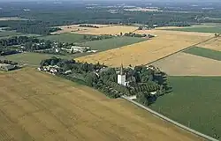Die Kirchensilhouette steigt in Art einer Treppe in drei Stufen an. Vom relativ niedrigen Chor über das höhere Langhaus zum kräftigen Kirchturm im Westen. Die Kirche ist in der umgebenden Ackerlandschaft gut zu erkennen. Trotz seiner bedeutenden Proportionen ist der Turm nicht zu seiner vollen Höhe ausgebaut worden. Das Glockengeschoss mit den Schallöffnungen musste im unteren Teil der Turmspitze untergebracht werden. Reste einer frühmittelalterlichen Steinkirche mit Turm aus verputztem Kalkstein sind unter der heutigen Kirche ausgegraben worden.