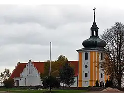 Der in der Spätgotik über dem Westgiebel des Schiffes errichtete Turm wurde im 18. Jahrhundert bis zur Höhe des Daches des Kirchenschiffs abgetragen. Danach wurde der heutige Turm am Westgiebel des Schiffes errichtet. Der rechteckige Turm ist mit farblich abgesetzten Pilastern geschmückt und endet oben mit einer Zwiebelkuppel mit Laterne.