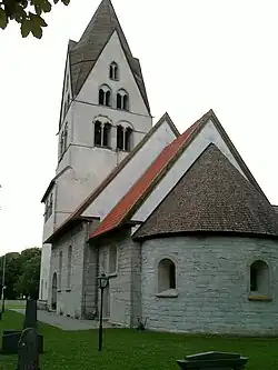 Außen dominiert der stattliche Galerieturm mit seinen spitzen Gieben und den mit Säulen versehenen Schallöffnungen in drei Ebenen, der durch eine kurze, achteckige Turmspitze gekrönt wird. Die Langhausfassade wird von einem Rundbogenfries geschmückt. Von den drei Rundbogenportalen der Kirche ist das Nordportal des Turmes das größte und am meisten ausgearbeitete. Die Fenster sind verändert worden und neue Fenster sind im 19. Jahrhundert hinzugekommen. Das Langhaus ist von innen durch vier Gewölbe gedeckt, im Osten Kreuzgewölbe und im Westen sogenannte Muschelgewölbe. Sie werden von einer Mittelsäule mit einem Kapitell, das mit Ornamenten geschmückt ist, getragen. Eine schmale rundbogige Maueröffnung führt zum Chor. Von interesse ist eine Nische in der Südmauer der Apsis, in deren Türen Runenschrift von ungefähr 1300 geritzt ist. In dem Westfenster des Turmraums gibt es Reste einer Glasmalerei vom Anfang des 14. Jahrhunderts. Die Kirche wurde 1955 nach Plänen des Architekten Olle Karth restauriert.