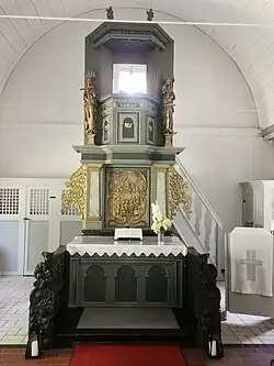 Der Kanzelaltar von 1742 ist aus einer schlichten Kanzel aus dem frühen 17. Jahrhundert und den Resten eines barocken Altarretabels zusammengesetzt. Von dem Jürgen Heitmann dem Jüngeren zugeschriebenen Retabel stammen das Relief unter dem Kanzelkorb, das das letzte Abendmahl Jesu mit seinen Jüngern darstellt, die Knorpelwerkanschwünge und zwei den Kanzelkorb rahmende Schnitzfiguren der Tugenden Fides (Glaube) und Spes (Hoffnung). Der Schalldeckel trägt eine niederdeutsche Inschrift. Unter der barocken Holzverkleidung hat sich die ursprüngliche Mensa von 1495 erhalten. Sie steht genau über der Fundstelle des Kreuzes.[4] Innen ist sie hohl, so dass der Blick auf den Fundort gewahrt blieb. Gerahmt wird der Altar von im Stil des Akanthusbarock geschnitzten Altarschranken von 1709, die neben Abbildern der vier Evangelisten das Spiegelmonogramm und Wappen des Stifters aus dem Geschlecht der Vogdemannen zeigt. Die Fassung von 1742 wurde bei der Renovierung 1999 wieder hergestellt. Ein gotisches Kreuz aus dem 16. Jahrhundert, das den Barockaltar bekrönt hatte, ist an der Orgelempore im Westen der Kirche angebracht. Hinter dem ursprünglich freistehenden Altar steht ein Opferstock, in den die Gemeindeglieder bei dem damals üblichen Umgang um den Altar bei der Abendmahlsfeier ihre Spenden einwarfen.[12]