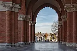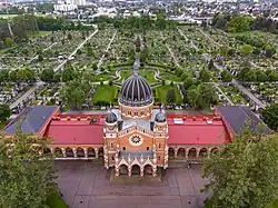 Markant für das Sakralgebäude, das in der Mittelachse des Zentralfriedhofs gelegen ist, ist der fast quadratische Grundriss und die mächtige zweischalige Kuppel, die von zwei kleineren Kuppeln flankiert wird. Der Zentralbau ist im Süden und Norden durch Arkadengänge mit dem Einsegnungs- und Aufbahrungssaal verbunden. In die Seitenmauern sind monumentale Radfenster eingelassen. Im Inneren des Rohziegelbaus schmücken die vier Evangelisten den Übergang zur Kuppel. Am Hochaltar befindet sich eine Darstellung des Erlösers. Das Ziborium befindet sich unterhalb der Kuppel und ist aus hellem Sandstein gefertigt.[2]
