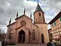 Die Kirchengemeinde Niebelsbach[16] umfasst den Ortsteil Niebelsbach der Gemeinde Keltern. Alle anderen Ortsteile Kelterns gehören zur Evangelischen Landeskirche in Baden. Der Ort besteht aus den beiden Siedlungen Oberniebelsbach und Unterniebelsbach, die 1927 zu einer Gemeinde vereinigt wurden. Die Kirche der heutigen Kirchengemeinde Niebelsbach befindet sich in Oberniebelsbach. Sie geht auf eine noch teilweise romanische Kapelle St. Pankratius zurück, die einen frühgotischen Chor hat. Wenngleich der Ort eine eigene Kirche hat, gehörte er kirchlich zunächst zum Kirchspiel Gräfenhausen, zu dem auch noch Arnbach gehörte. Unterniebelsbach hingegen gehörte kirchlich zunächst zu Rudmersbach, bevor es 1497 ebenfalls zu Gräfenhausen kam. Durch Bekanntmachung des Oberkirchenrats vom 27. Dezember 1971 wurde das Kirchspiel Gräfenhausen aufgelöst, Arnbach zur selbständigen Kirchengemeinde und Pfarrei erhoben, der auch Niebelsbach als Filialkirchengemeinde zugeordnet wurde.