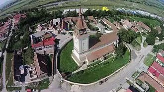 Die Kirchenburg von Feldioara mit ihrem Ringmauer-Überrest inmitten des Ortes (2014). | ||