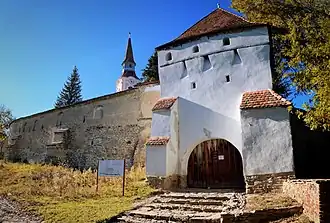 Die Kirchenburg steht im Nordwesten des Dorfzentrums. Die Wehrmauer ist 7–8 m hoch und war durch fünf Türme verstärkt, von denen vier erhalten sind. Der ruinöse Südturm war der frühere Eingang zur Anlage, der mit einem Fallgatter gesichert war. Heute gelangt man über den Ostturm in die Anlage. Im nördlichen Bereich des Berings wurden im 16. Jahrhundert Zwinger, Parch genannt, angebaut, in denen man bei Belagerung das Vieh hielt. Ein dritter Zwinger im Süden wurde im 18. Jahrhundert angefügt.