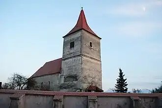 Die dreischiffige Kirche mit Westturm stammt aus dem 13. Jahrhundert. Der Turm hat im Erdgeschoss ein Kreuzgewölbe, darüber einen flach gedeckten Raum und im dritten Stock wieder ein Kreuzgewölbe sowie Schießscharten. Das romanische Westportal hat zwei Rücksprünge, in denen Säulen mit bauzeitlicher Blattornamentik stehen. Bögen mit rundem Profil über der Archivolte entsprechen den Säulen. Später wurden zur Befestigung der Wehrkirche die Seitenschiffe und die Apsis abgetragen und der Turm um zwei Stockwerke erhöht. Das heutige Tonnengewölbe mit Stichkappen, das auf Pilastern mit profilierten Kapitellen ruht, stammt von 1765.