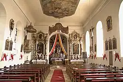 Hinter dem barocken Chorbogen befindet sich der Chor mit hochliegender Flachdecke im Ostturm. Bis auf ein dortiges kleines Rundbogenfenster aus der Zeit der Romanik sind alle Kirchenfenster barock. Das Deckengemälde des Langhauses, 1792 von Willibald Wunderer gemalt, stellt das Patrozinium „Mariä Geburt“ dar. Von Maria sind zwei Statuen vorhanden, eine spätgotische von 1420 unter der Empore und eine barocke von 1738 auf dem Hochaltar, die sich bis 1939 am Toreingang der inneren Friedhofsbefestigung befand. Der Taufstein besteht aus einem Muschelbecken auf Balusterfuß vom Ende des 17. Jahrhunderts.