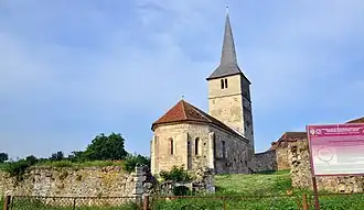 Der Ort ist 1206 in einer Urkunde von Andreas II. von Ungarn als Ortschaft der Saxones erwähnt. Die Wehrkirche stammt ursprünglich aus dem 13. Jahrhundert. Die romanische Basilika wurde Ende des 13. Jahrhunderts mit einem 3/6-Chor ergänzt. Während Restaurierungsarbeiten von 1966 bis 1968 wurden das Westportal und die Zwillingsfenster des Glockenturms freigelegt und konsolidiert.[1]