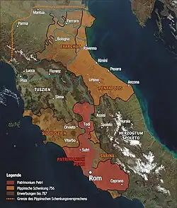 Als frühestmögliche Staatsgründung bzw. als Schlüsselereignis auf dem Weg zur Bildung des Kirchenstaates wird in Italien die Schenkung von Sutri im Jahr 728 angesehen.[2] Um die Rückendeckung oder zumindest Neutralität des Papstes gegen langobardische Rivalen zu gewinnen, soll der langobardische König Liutprand Papst Gregor II. die den Byzantinern abgenommene Latium-Stadt Sutri überantwortet haben. Nach der Beilegung einer erneuten Konfrontation 739 gab Liutprand 741 bzw. 742 noch die Orte Amelia, Orta, Bomarzo und Bieda hinzu.[3]