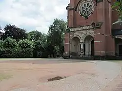 Auf der Ostseite des Vorplatzes grenzt hinter einer Hecke der tieferliegende Ehrenhain an, der innerhalb des Kirchendenkmals als Gartendenkmal geschützt ist. Vor der Hecke verläuft der Kirchplatz, an der Kirche vorbei, als Fußweg zur südlichen Rückseite der Kirche. Östlich des Fußwegs, mit dem Eingang auf der Südseite, liegt das neu errichtete Gemeindehaus. Östlich dieses Neubaus schließt sich der rückwärtige Garten des Karl-May-Museums an.