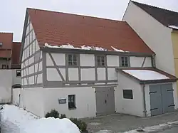 Das Gebäude an der Nordwestecke des Platzes ist frühestens um 1700 aus Ziegeln erbaut. Das Gebäude ist zweigeschossig, 5-achsig mit Krüppelwalmdach (liegender Dachstuhl, traufständig zum Platz). Unter dem östlichen Teil ist ein Keller mit Tonnengewölbe.[14] Im örtlichen Denkmalverzeichnis ist das Bauwerk unter der Erfassungsnummer 09120318 verzeichnet. Nutzung als Pfarrhaus, jetzt Gemeindebüro, früher Diakonat und Subdiakonat.