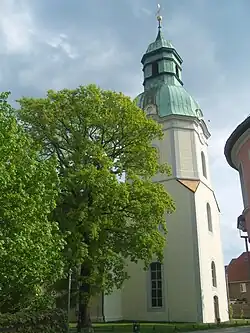 Die Kirche hatte mehrere Vorgängerbauten, zuletzt aus dem 15. Jahrhundert. Bei einem Brand 1768 wurde auch dieser zerstört. 1772–1774 wurde die Kirche nach Plänen von Samuel Locke wieder aufgebaut und erneuert. 1991 wurde die Kirche renoviert. Im Inneren befindet sich ein Taufstein aus dem Jahre 1710.[3][4] 2005/6 wurde das Fundament des Kirchturms durch Betoninjektion stabilisiert.[8] Im örtlichen Denkmalverzeichnis ist das Bauwerk unter der Erfassungsnummer 09120217 verzeichnet.[9]