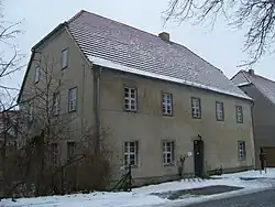 Das Gebäude an der Nordwestecke des Platzes ist um 1770 mit verputztem Ziegelmauerwerk erbaut und besitzt ein Satteldach mit einfach stehendem Dachstuhl sowie eine Oberlaubengalerie. Das Untergeschoss ist massiv, Obergeschoss mit Fachwerk.[13] Im örtlichen Denkmalverzeichnis ist das Bauwerk unter der Erfassungsnummer 09120368 verzeichnet, steht aber in der Landesliste unter Berliner Straße 17.