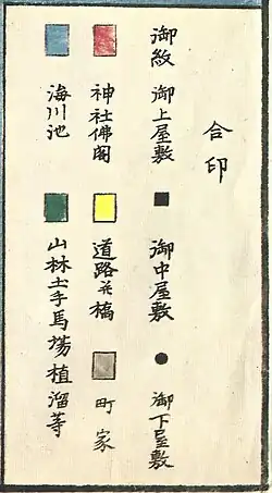 - ↑ Die Notierung der Namen hochrangiger Bewohner auf Karten hat sich bis in die frühe Meiji-Zeit erhalten.
