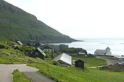 - die in Richtung Kirkjubønes liegenden Überreste eines Kirchengebäudes, die heute als „Líkhús“ bezeichnet werden. Es wird angenommen, dass es sich um die Überbleibsel des kirchlichen Gebäudes handelt, welches in einem Schriftstück des Bischofs Johannes Theutonicus im Jahr 1420 erwähnt wird und welches dem irischen Seefahrer-Heiligen Brendan geweiht war. Dessen Verehrung war zur damaligen Zeit gerade unter hanseatischen Kaufleuten und Seefahrern verbreitet, die die kirchlichen Bauaktivitäten in Kirkjubøur auch finanziell unterstützten.[6] Der Uferbereich, der unmittelbar vor den Überresten liegt, wird heute noch Brandansvík genannt.[7][3] Nach anderen Angaben soll es sich einer Legende zufolge jedoch um eine Marienkapelle gehandelt haben, die mit der sagenhaften Frau namens Gæsa in Verbindung gebracht wird.[8]