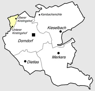Im Werratal, gegenüber der Kerngemeinde Dorndorf befinden sich die als Unterer und Oberer Kirstingshof bezeichneten Siedlungsteile am Südrand des Frauenseer Forstes. Der Ortsteil wird über die Bundesstraße 84 erreicht. Nördlich des Oberen Kirstingshofes markiert der bewaldete Berg Hohe Wart die nördliche Gemarkungsgrenze und bildet zugleich die höchste Erhebung von Kirstingshof, seine Höhe beträgt 400,9 m ü. NN.[1]
