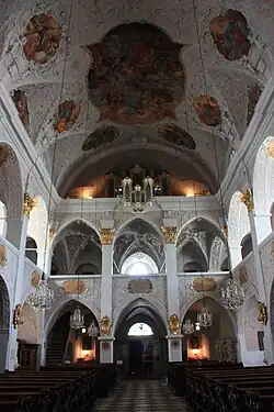 Die Kirche ist eine weiträumige Emporenhalle. Das Kirchenschiff besitzt ein Tonnengewölbe, die Stichkappen leiten mit Sichtschächten zu den Fenstern über. An drei Seiten befinden sich Arkadengänge. An der Nord- und Südseite sind die Pfeilerarkaden rundbogig, an der Westseite spitzbogig, ein Anklang an die Spätgotik. Im Erdgeschoß sind die Arkaden durch Zwischenmauern zu Kapellen geworden: Je vier an den Längswänden, drei an der westlichen Schmalseite. Pilaster unterteilen das Schiff in vier Joche, sie tragen ein vorkragendes Gesims, das die Wand vom Gewölbe trennt. Wände und Gewölbe tragen einen reichen, dichten Stuckdekor. Der dreijochige Chor ist langgestreckt, tonnengewölbt und besitzt einen halbrunden Schluss.