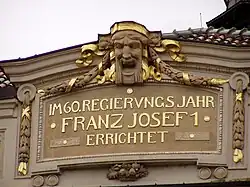 - Unter dem Dachfirst, als Bestandteil der Zierbalustrade befindet sich die Erinnerungstafel. Sie ist vorspringend umrahmt mit einem Podestansatz, zwei stilisierte Säulen und von einem angedeuteten, geschwungenen Dachgiebel bedeckt, dem ein allegorischer Grimassenkopf vorgehängt ist. In dieser Umrahmung befindet sich die Tafel mit dem folgenden Text: