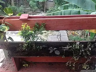Der Botanische Garten befindet sich innerhalb der Holzstruktur und umfasst Blumen, Kosmetikpflanzen, Gewürze und Heilpflanzen. Der Klanggarten ist mit einem nachhaltigen „Tropf“-Bewässerungssystem (Hydrokultur) ausgestattet, das einen autonomen Betrieb von bis zu sechs Monaten ermöglicht. Regenwasser wird gesammelt, in Fässern gespeichert und dann über transparente Rohre Tropfen für Tropfen an den vertikalen Garten abgegeben. Dieses System funktioniert ohne Wasserverluste und macht einen ständigen Einsatz der Bewohner entbehrlich. Die Wassertropfen fallen in Kisten unterschiedlicher Größe, erzeugen Töne und bewässern die Pflanzen für die Bewohner von Bonamouti. Die unterschiedlichen Töne, die aus dem Garten dringen, haben einen direkten Bezug zum Wasserbedarf der Pflanzen. Der hängende Garten gedeiht beim Klang der Tropfen und lädt die Öffentlichkeit ein, den Wouri-Fluss von den drei Ebenen aus zu beobachten.