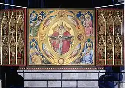Kurz nach 1900 wurde entschieden, den Hochaltar im Dom von seinem Barockaufbau zu befreien und in den mittelalterlichen Zustand zurückzuversetzen. Im Zuge dieser Umgestaltung wurde der Klarenaltar hinter dem Hochaltar aufgestellt, so dass er erstmals frei im Raum stand. Mit der Gestaltung der Rückseite wurde 1905 der neugotische Künstler Friedrich Wilhelm Mengelberg beauftragt, der damit eines der jüngsten Werke der Neugotik im Dom schuf.[33] Das Gemälde zeigt in einer mandelförmigen Rahmung die göttliche Dreifaltigkeit. Diese ist von vier Seraphim umgeben. In den vier Zwickeln hat Mengelberg die vier Evangelisten abgebildet.[34]