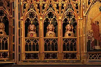 Von den Figuren der zwölf Apostel stammen sieben aus dem Mittelalter; zwei von ihnen befinden sich im Original im Museum Schnütgen und wurden durch Kopien ersetzt. Fünf Figuren wurden im Jahr 1881 von Christoph Stephan im Zuge der damaligen Restaurierung ergänzt. Von den Reliquienbüsten für das Gefolge der Ursula sind elf aus dem Mittelalter überliefert; eine davon konnte Domarchivar Rolf Lauer erst 2005 in Caracas wiederentdecken. Eine Reliquienbüste auf der linken Seite wurde im 19. Jahrhundert neu geschaffen.[37]